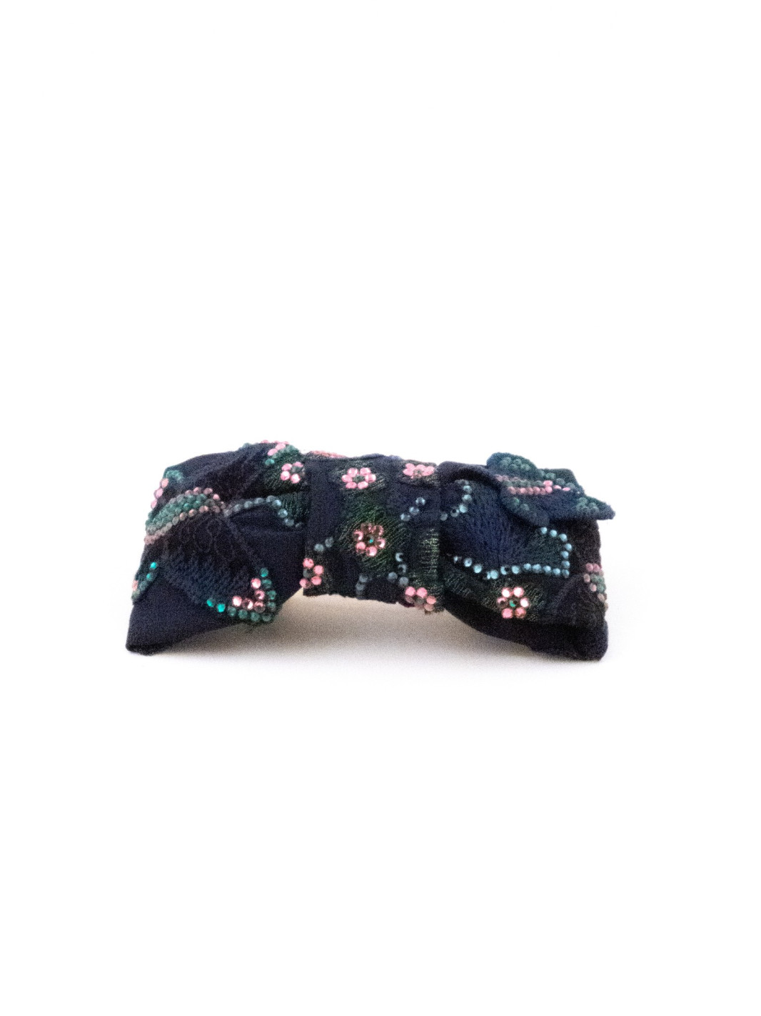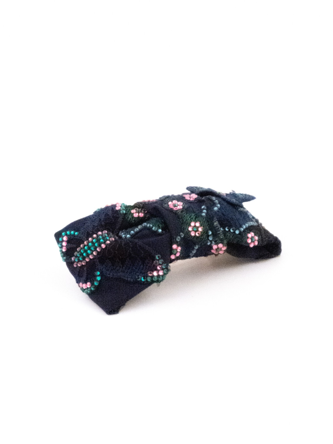 On deep navy blue fabric, small pink and turquoise flowers are embroidered with remarkable finesse. The clip is tied in a graceful bow that adds a poetic, romantic touch. A discreet yet precious accessory, perfect for holding back a strand or embellishing a chignon.