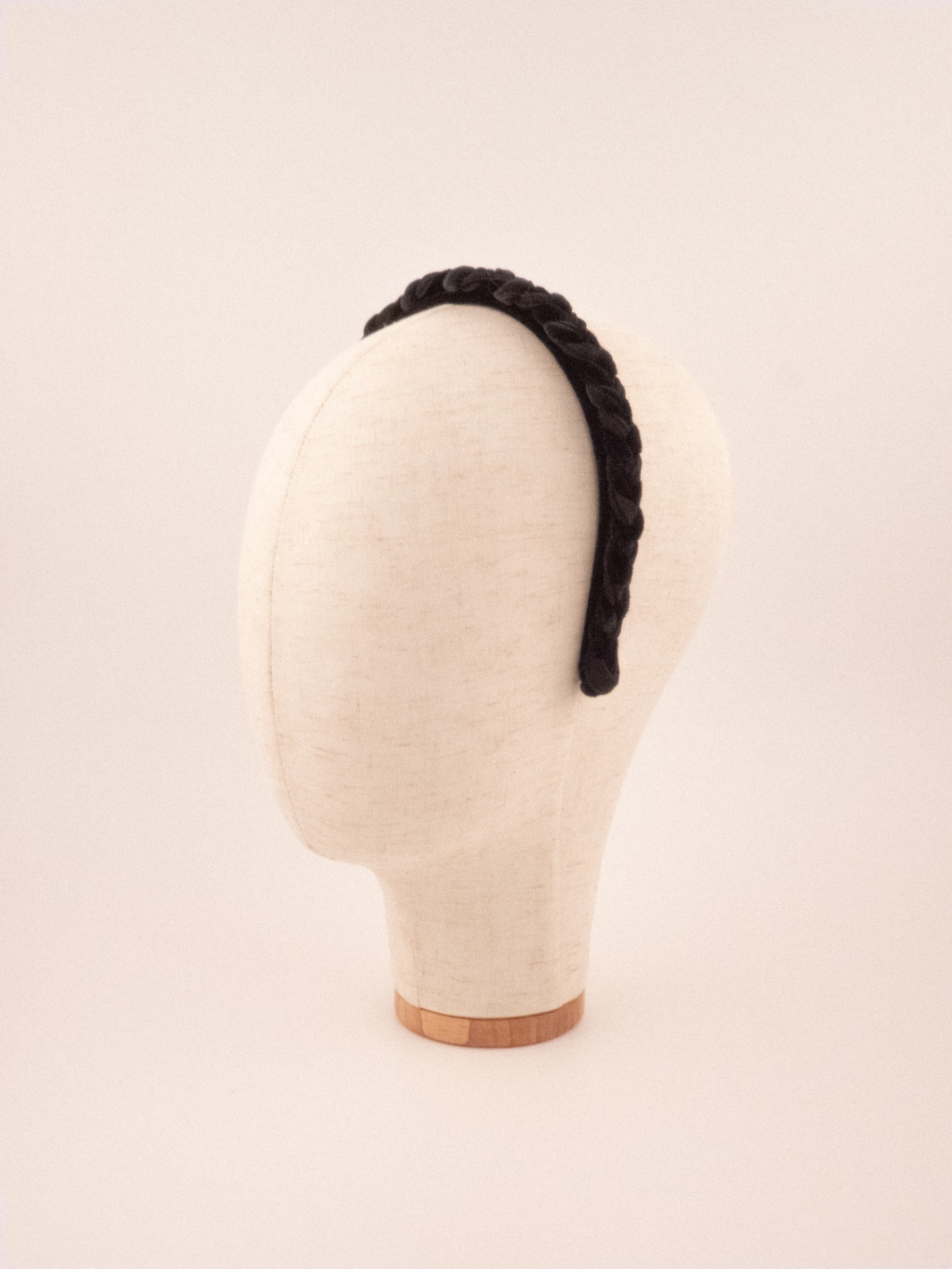 Black satin is braided into an elegant, structured rope that frames the face with understated sophistication. The material catches the light with soft reflections, creating a subtle play of shadows within each twist. This headband is the ultimate timeless accessory – equally at home with jeans or an evening gown.