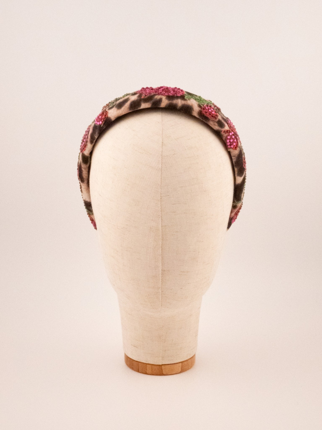Rosy cherries embroidered with pearls and their small green leaves bloom on a soft leopard print. The blend of animal print and fruity motifs creates a playful yet refined contrast. This headband brings a touch of chic whimsy to every hairstyle.