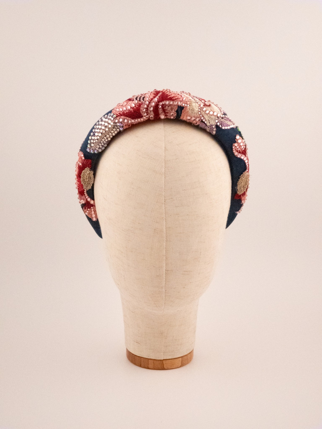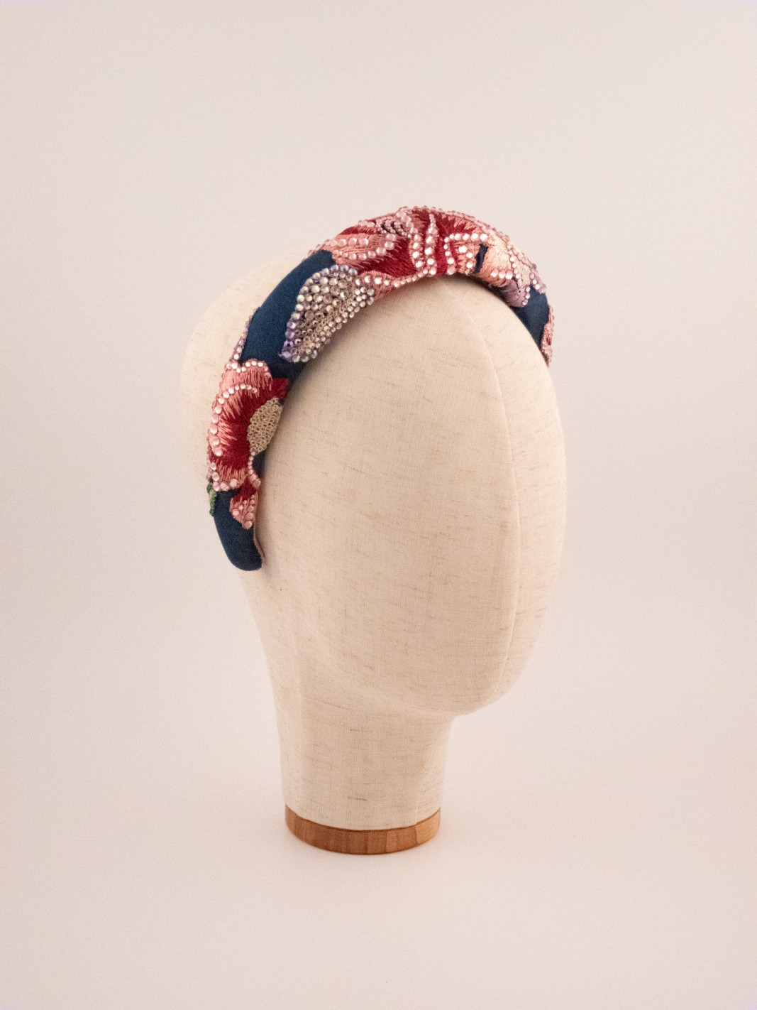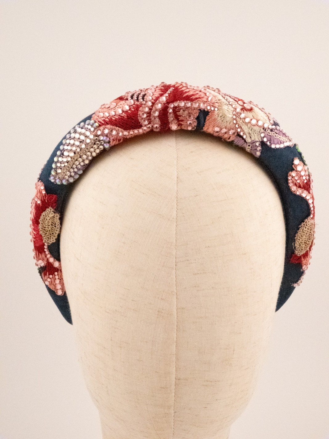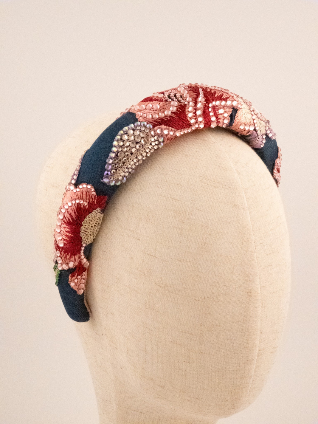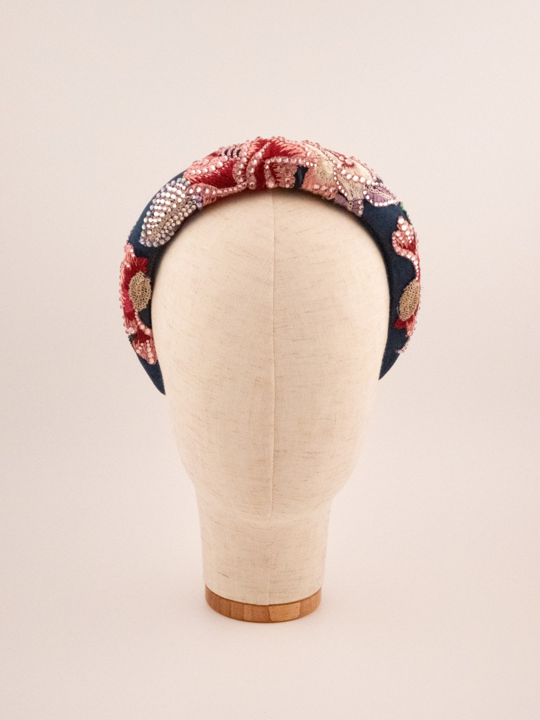 On a canvas of deep navy velvet, embroidered flowers bloom in soft pink, crimson, and lavender, their petals outlined with sparkling rhinestones and emerald green accents. This headband captures the magic of a moonlit garden in full bloom — mysterious, romantic, and alive with color. The rich contrast of dark base and vivid embroidery creates a piece of stunning visual depth.