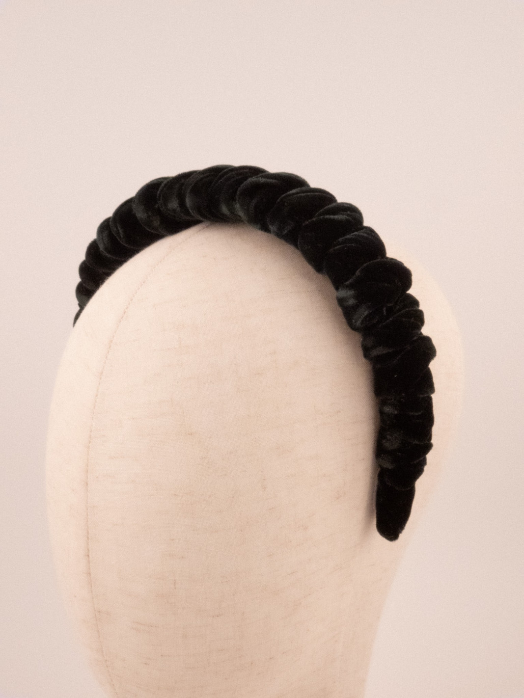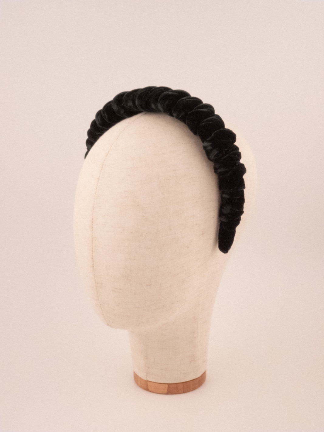 Black velvet coils into a regular, sculptural twist that brings volume and structure. The material catches the light with soft reflections, creating a mysterious, refined play of shadows. A timeless headband for women who prefer elegance without frills.