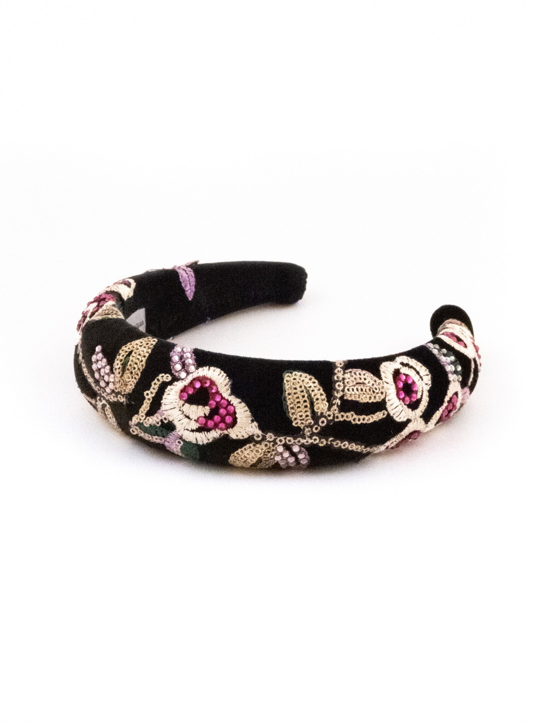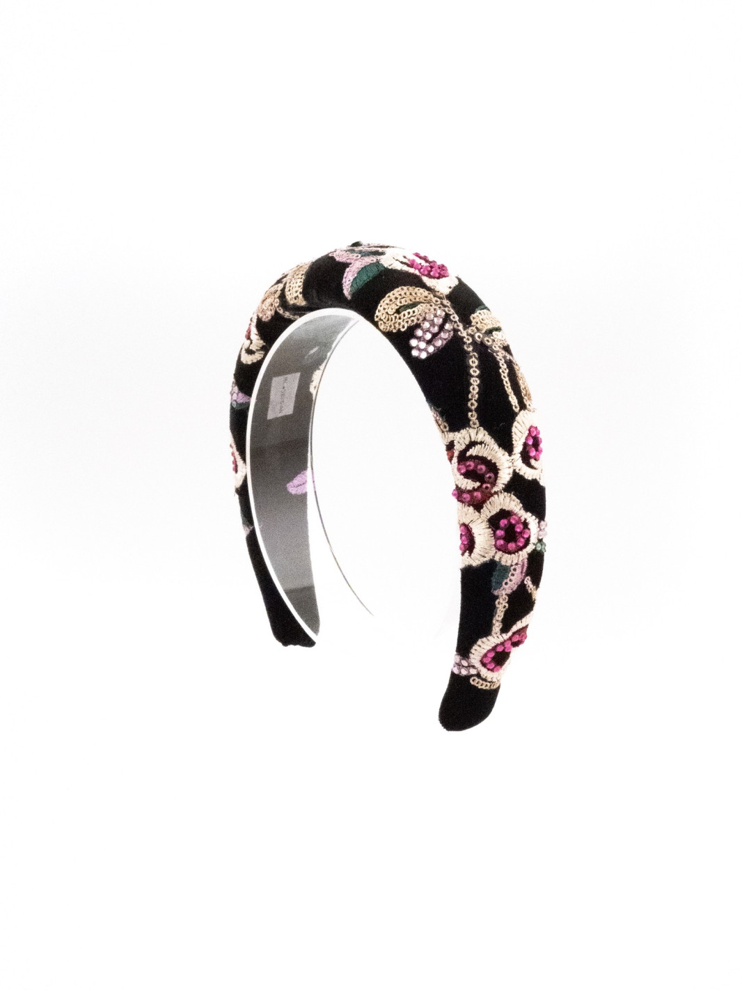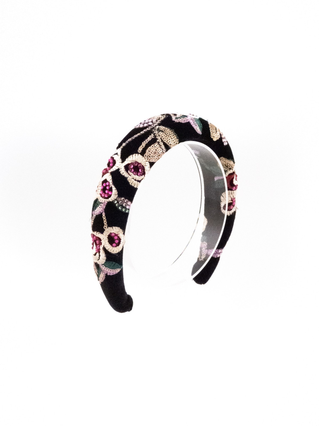 Delicate roses embroidered in pink and silver threads bloom on the deep black velvet of this scrunchie. Rhinestone-embroidered foliage adds a touch of precious light. A striking contrast between the softness of velvet and the brilliance of embroidery that enhances every hairstyle.