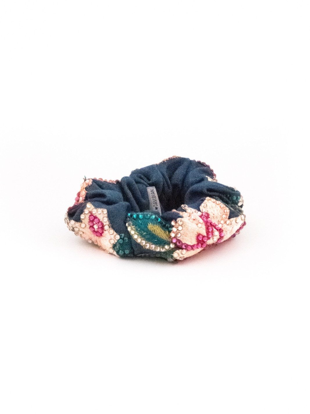 Delicate pink blossoms and emerald leaves emerge from a background of deep teal velvet, each adorned with hand-set rhinestones that twinkle like fireflies. This scrunchie brings the enchantment of a secret garden at twilight to your hair. The combination of embroidery, beading, and crystal work creates a richness of texture that is simply mesmerizing.